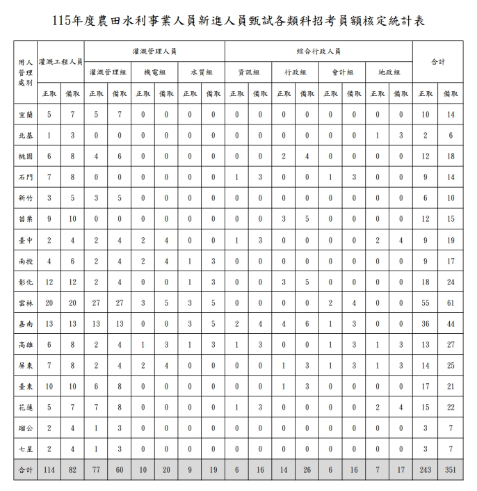 115 115年度農田水利事業人員新進人員甄試各類科招考員額核定統計表.jpg